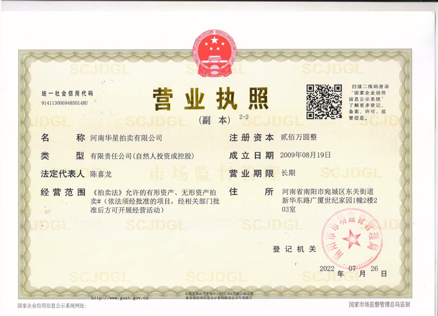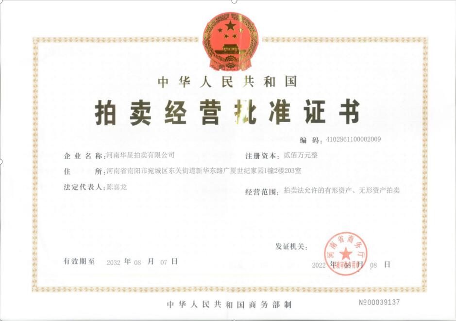 河南華星拍賣有限公司是經(jīng)河南省商務(wù)廳批準(zhǔn),南陽(yáng)市工商行政管理局依法注冊(cè)登記的綜合性拍賣機(jī)構(gòu)。公司成立于2009年8月,注冊(cè)資金100萬(wàn)元人民幣,經(jīng)濟(jì)性質(zhì)為有限責(zé)任公司,2013年7月取得由河南省財(cái)政廳頒發(fā)的“河南省公物拍賣資格證書”,F(xiàn)為河南省拍賣行業(yè)協(xié)會(huì)會(huì)員單位,中國(guó)拍賣行業(yè)協(xié)會(huì)會(huì)員單位,南陽(yáng)市財(cái)政局中標(biāo)單位,唐河縣財(cái)政局中標(biāo)單位。南陽(yáng)市農(nóng)業(yè)銀行中標(biāo)單位,鄧州市機(jī)關(guān)事務(wù)管理局中標(biāo)單位、鎮(zhèn)平縣礦山修復(fù)廢礦產(chǎn)處置拍賣機(jī)構(gòu)(唯一中標(biāo))。 本公司的業(yè)務(wù)范圍為:行政執(zhí)法機(jī)關(guān)依法處理物品,充抵稅款的物品;審判機(jī)關(guān)依法處理的物品,充抵罰金、罰款的物品,無法返還的追回物品;檢察機(jī)關(guān)依法追回的物品;航運(yùn)、郵政、公路等部門獲得的需處理的物品;金融部門需處理的借款抵押財(cái)產(chǎn),保險(xiǎn)公司理賠后需處理的損余物品;國(guó)家機(jī)關(guān)、事業(yè)單位和國(guó)有企業(yè)按有關(guān)規(guī)定需要處理的財(cái)產(chǎn)及需要變賣的公物;國(guó)家機(jī)關(guān)工作人員在公務(wù)交往和外事活動(dòng)中接受的按規(guī)定需要交公處理的物品;其他方面需要處理的國(guó)有資產(chǎn),如國(guó)有資源、房地產(chǎn)、設(shè)備、攤亭、營(yíng)運(yùn)線路的經(jīng)營(yíng)權(quán),國(guó)有土地、吉利號(hào)碼的使用權(quán),街道、路橋冠名權(quán),新聞媒體和公用設(shè)施廣告的發(fā)布權(quán)等。公司現(xiàn)有國(guó)家注冊(cè)拍賣師4名,會(huì)計(jì)師1名,律師1名,具有拍賣從業(yè)資格的專職人員3名,具有業(yè)務(wù)人員數(shù)名。 本公司嚴(yán)格按照《拍賣法》的規(guī)定程序,規(guī)范運(yùn)作,受到委托單位及競(jìng)買人的充分肯定,為競(jìng)買人及委托單位創(chuàng)造一個(gè)互惠互利、共同發(fā)展的良好平臺(tái),贏得了社會(huì)的廣泛信譽(yù)。